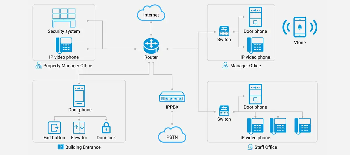 Akuvox Vfone proqramı vasitəsilə işçilər smartfonlarının video zəng və uzaqdan qapının kilidini açmaq kimi zəngin interkom funksiyalarından istifadə edə biləcəklər ki, bu da ofisdə olmadıqları halda heç bir ziyarətçini qaçırmayacağına əmin olur.