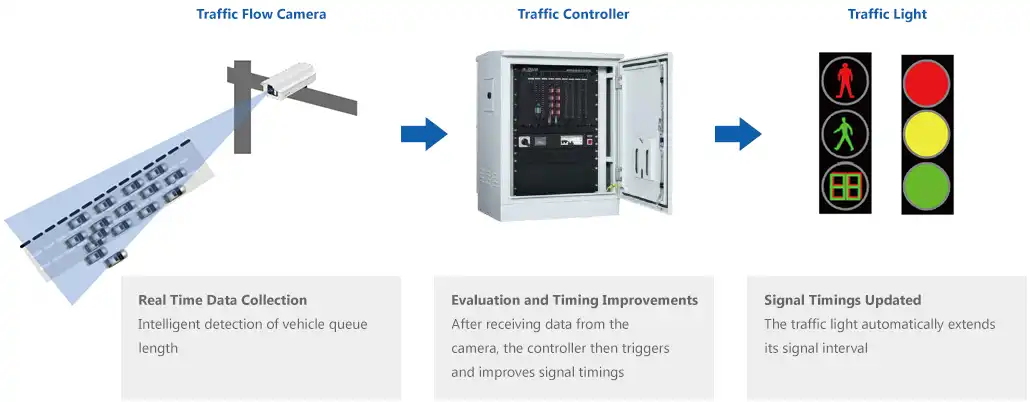 Trafik axını kamerası əvvəlcədən müəyyən edilmiş zolaqlarda olan nəqliyyat vasitələrini aşkarlayır və Ethernet bağlantısı vasitəsilə avtomobil növbələrinin uzunluğunu nəzarətçiyə göndərir. Sonra nəzarətçi siqnal vaxtlarını işə salır və avtomatik olaraq təkmilləşdirir.